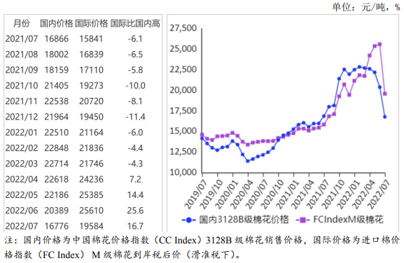 (二)國際棉價明顯回落。本月,美國農(nóng)業(yè)部(USDA)調(diào)減新年度全球棉花消費(fèi)量,受全球需求疲軟預(yù)期影響,棉價大幅下跌。7月CotlookA指數(shù)(相當(dāng)于國內(nèi)3128B級棉花)月均價每磅131.03美分,環(huán)比跌15.4%,同比漲34.5%。