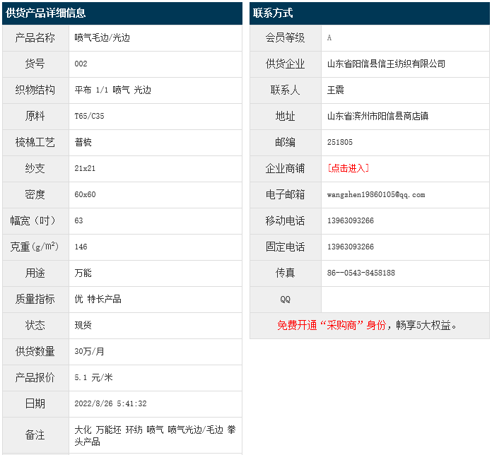 8月25日,山東陽(yáng)信縣信王紡織有限公司大化滌棉平布T65/C35 21x21 60x60 63" 1/1 146g/㎡ 噴氣 毛邊/光邊,報(bào)價(jià)為5.1元/米,實(shí)際成交價(jià)以協(xié)商為準(zhǔn)。[點(diǎn)擊查看詳情]