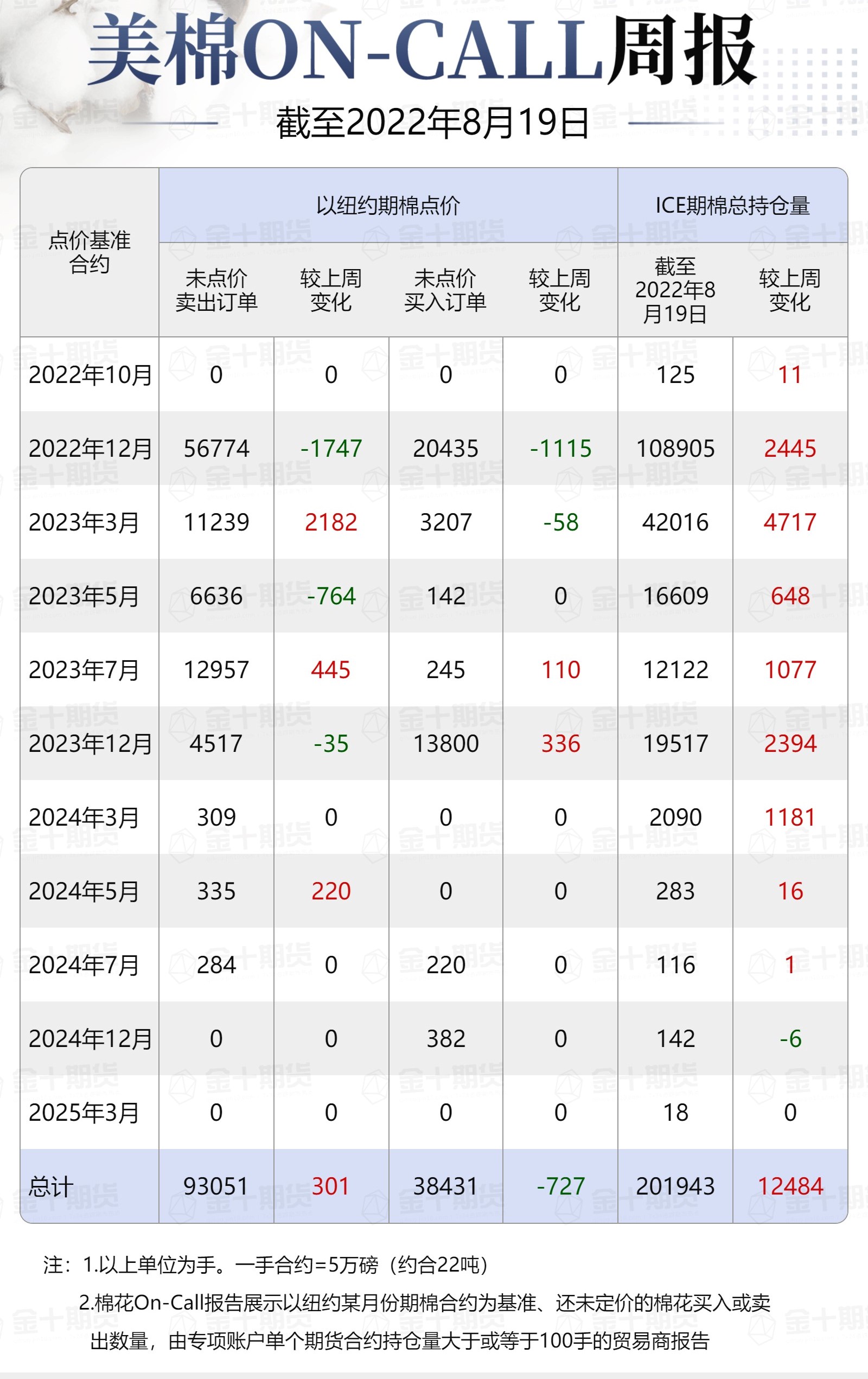 據(jù)美國(guó)商品期貨交易委員會(huì)(CFTC)最新數(shù)據(jù),截至8月19日,①美棉On-Call未點(diǎn)價(jià)賣(mài)出訂單93051手,環(huán)比增加301手;未點(diǎn)價(jià)買(mǎi)入訂單38431手,環(huán)比減少727手;②ICE期棉202210合約上賣(mài)方未點(diǎn)價(jià)合約為0手,較此前一周增加0手;③ICE期棉202212合約上賣(mài)方未點(diǎn)價(jià)合約為56774手,較此前一周減少1747手;④ICE期棉2303合約上賣(mài)方未點(diǎn)價(jià)合約為11239手,較此前一周增加2182手;⑤ICE期棉2305合約上賣(mài)方未點(diǎn)價(jià)合約為6636手,較此前一周減少764手;⑥ICE期棉2307合約上賣(mài)方未點(diǎn)價(jià)合約為12957手,較此前一周增加445手;⑦ICE棉花期貨盤(pán)面2022/23年度(8月至次年7月)的On-Call合約未點(diǎn)價(jià)賣(mài)出訂單為87606手,環(huán)比增加116手。