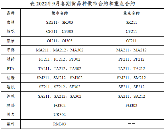 表2022年9月各期貨品種做市合約和重點(diǎn)合約