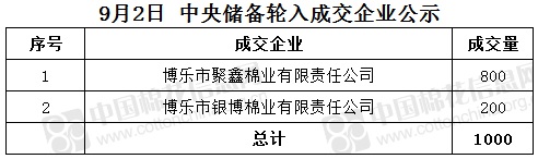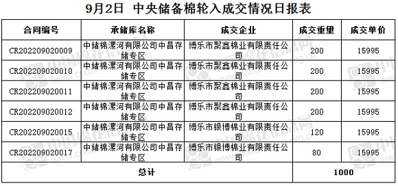 9月2日,中國儲備棉管理有限公司掛牌采購棉花6000噸(公定重量),實際成交1000噸,成交率17%,成交均價15995元/噸,成交最高價15995元/噸,成交最低價15995元/噸。