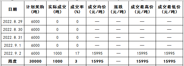 2022年8月29日至9月2日是2022年中央儲備棉輪入第八周,中國儲備棉管理有限公司掛牌采購30000噸,實際成交1000噸,成交率3%,成交均價15995元/噸,成交最高價15995元/噸,成交最低價15995元/噸。