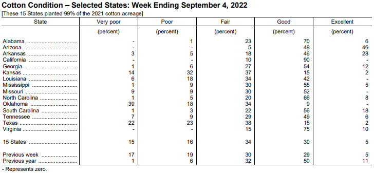 美國農(nóng)業(yè)部9月6日發(fā)布的美國棉花生長報(bào)告顯示,截至9月4日當(dāng)周,美棉結(jié)鈴率為97%,前周為94%,去年同期為93%,五年均值為96%。美棉盛鈴率為39%,前周為28%,去年同期為28%,五年均值為32%。美棉生長優(yōu)良率為35%,前周為34%,去年同期為61%。