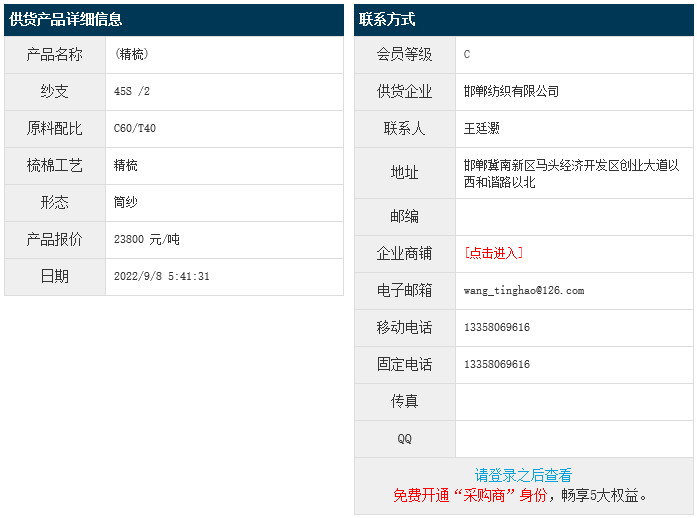 9月8日,邯鄲紡織有限公司滌棉紗JCVC60/40 45S/2,報(bào)價為23800元/噸,實(shí)際成交價以協(xié)商為準(zhǔn)。[點(diǎn)擊查看詳情]