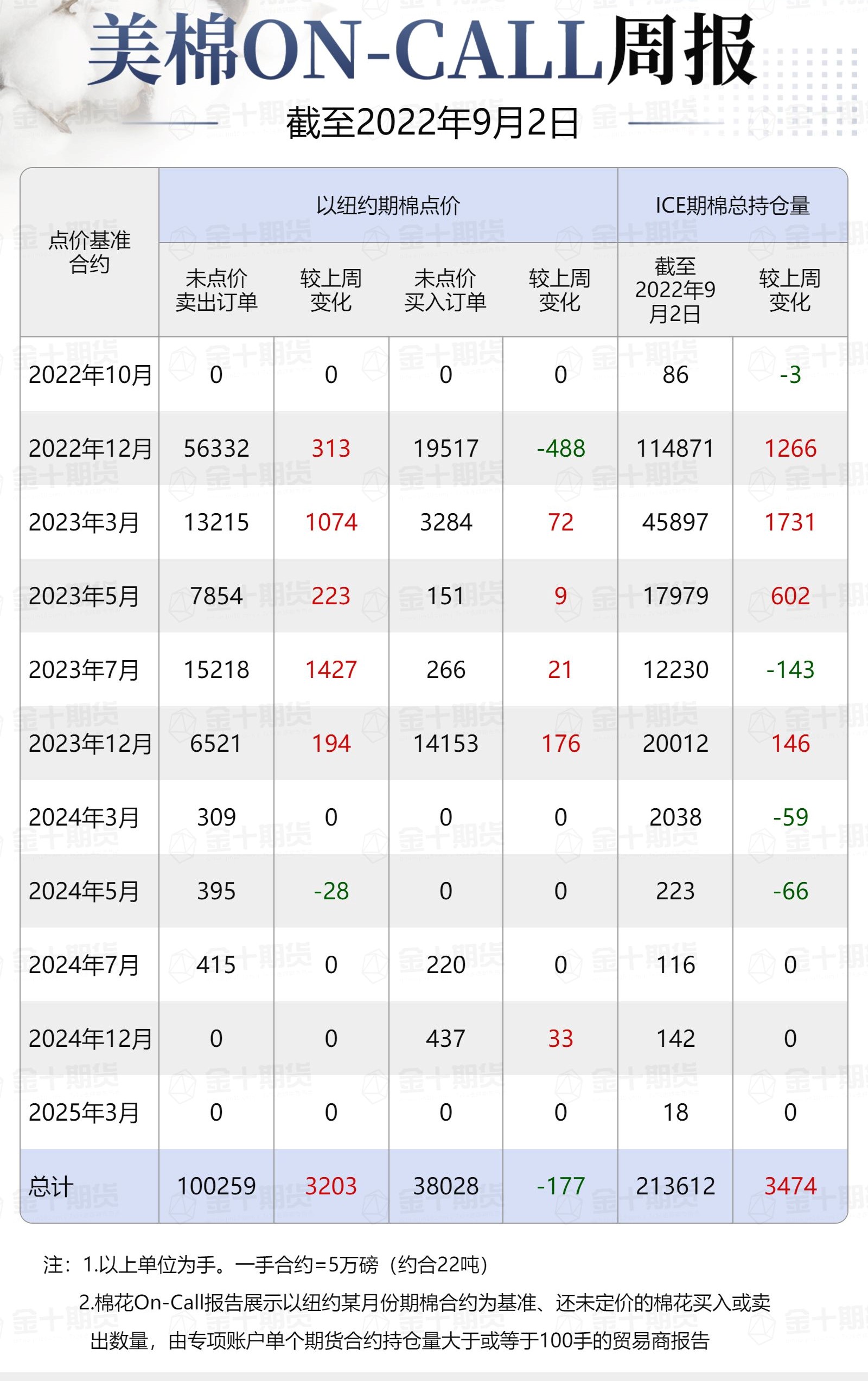 據(jù)美國(guó)商品期貨交易委員會(huì)(CFTC)最新數(shù)據(jù),截至9月2日,①美棉On-Call未點(diǎn)價(jià)賣(mài)出訂單100259手,環(huán)比增加3203手;未點(diǎn)價(jià)買(mǎi)入訂單38028手,環(huán)比減少177手;②ICE期棉2210合約上賣(mài)方未點(diǎn)價(jià)合約為0手,較此前一周增加0手;③ICE期棉2212合約上賣(mài)方未點(diǎn)價(jià)合約為56332手,較此前一周增加313手;④ICE期棉2303合約上賣(mài)方未點(diǎn)價(jià)合約為13215手,較此前一周增加1074手;⑤ICE期棉2305合約上賣(mài)方未點(diǎn)價(jià)合約為7854手,較此前一周增加223手;⑥ICE期棉2307合約上賣(mài)方未點(diǎn)價(jià)合約為15218手,較此前一周增加1427手;⑦ICE棉花期貨盤(pán)面2022/23年度(8月至次年7月)的On-Call合約未點(diǎn)價(jià)賣(mài)出訂單為92619手,環(huán)比增加3037手。