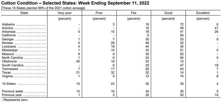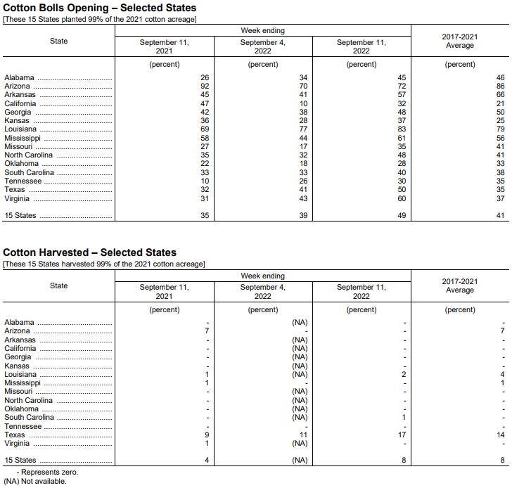 美國(guó)農(nóng)業(yè)部9月12日發(fā)布的美國(guó)棉花生長(zhǎng)報(bào)告顯示,截至9月11日當(dāng)周,美棉盛鈴率為49%,前周為39%,去年同期為35%,五年均值為41%。美棉收割率為8%,去年同期為4%,五年均值為8%。美棉生長(zhǎng)優(yōu)良率為33%,前周為35%,去年同期為64%。