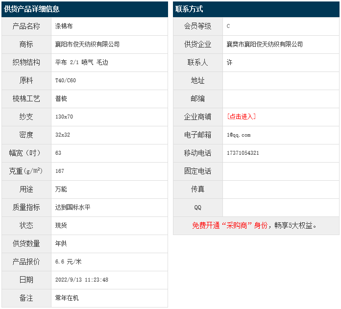 9月13日,襄樊襄陽(yáng)俊天紡織有限公司滌棉平布CVC60/40 130x70 32x32 63" 2/1 167g/㎡ 噴氣 毛邊,報(bào)價(jià)為6.6元/米,實(shí)際成交價(jià)以協(xié)商為準(zhǔn)。[點(diǎn)擊查看詳情]