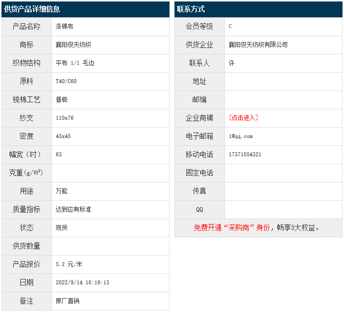 9月14日,襄陽俊天紡織有限公司滌棉平布CVC60/40 110x76 45x45 63" 1/1 毛邊,報(bào)價(jià)為5.2元/米,實(shí)際成交價(jià)以協(xié)商為準(zhǔn)。[點(diǎn)擊查看詳情]
