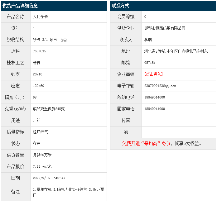 9月16日,邯鄲恒晟紡織有限公司大化滌棉紗卡T65/JC35 20xOE16 120x60 63" 3/1 成品245g/㎡ 噴氣 毛邊,報價為7.85元/米,實際成交價以協(xié)商為準。[點擊查看詳情]