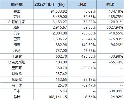 據(jù)海關(guān)統(tǒng)計數(shù)據(jù),2022年8月我國進(jìn)口棉花約11萬噸,環(huán)比減少約1萬噸,同比增長約24.9%。
