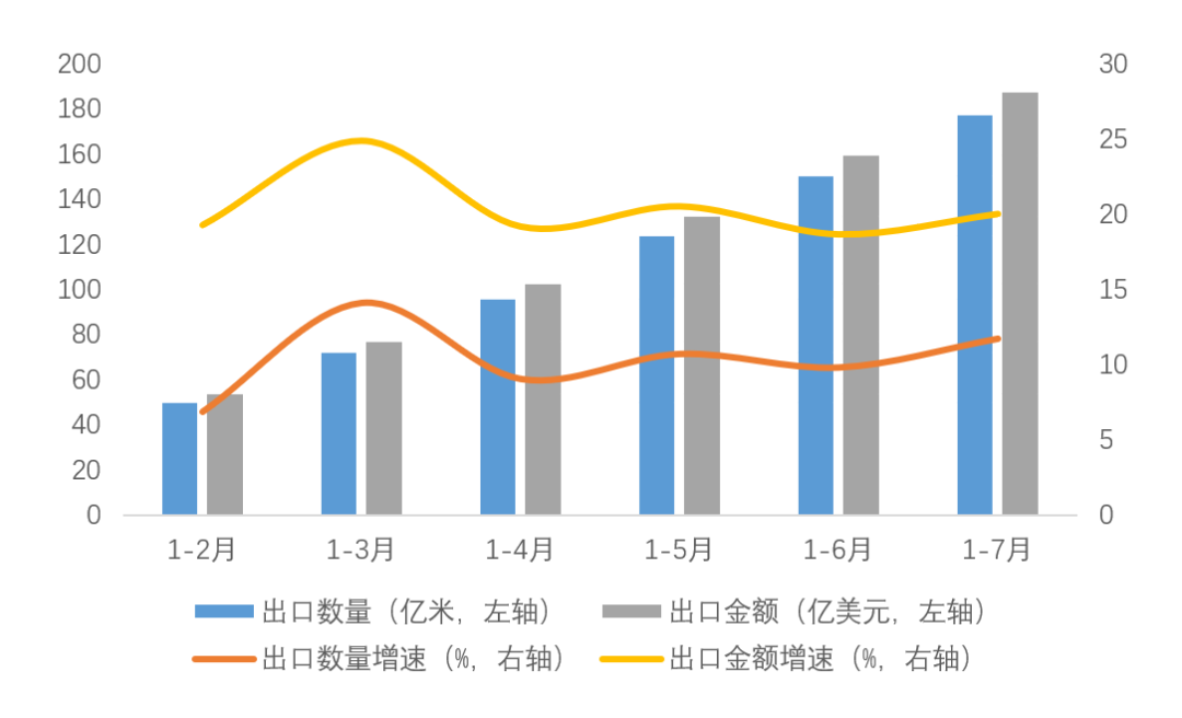 據(jù)中國海關(guān)統(tǒng)計(jì)數(shù)據(jù),2022年1-7月印染八大類產(chǎn)品出口數(shù)量176.93億米,同比增長11.72%,增幅較上半年擴(kuò)大1.91個(gè)百分點(diǎn);出口金額187.07億美元,同比增長20.00%,增幅較上半年擴(kuò)大1.36個(gè)百分點(diǎn);出口平均單價(jià)1.06美元/米,同比提高7.42%。今年以來,盡管外部環(huán)境風(fēng)險(xiǎn)挑戰(zhàn)增多,但總體看,國際市場(chǎng)對(duì)我國印染產(chǎn)品需求相對(duì)平穩(wěn),尤其是對(duì)合成長絲織物需求明顯增長,1-7月合成長絲織物出口數(shù)量同比增長20.79%,是印染行業(yè)外貿(mào)保持較快增長的主要原因。