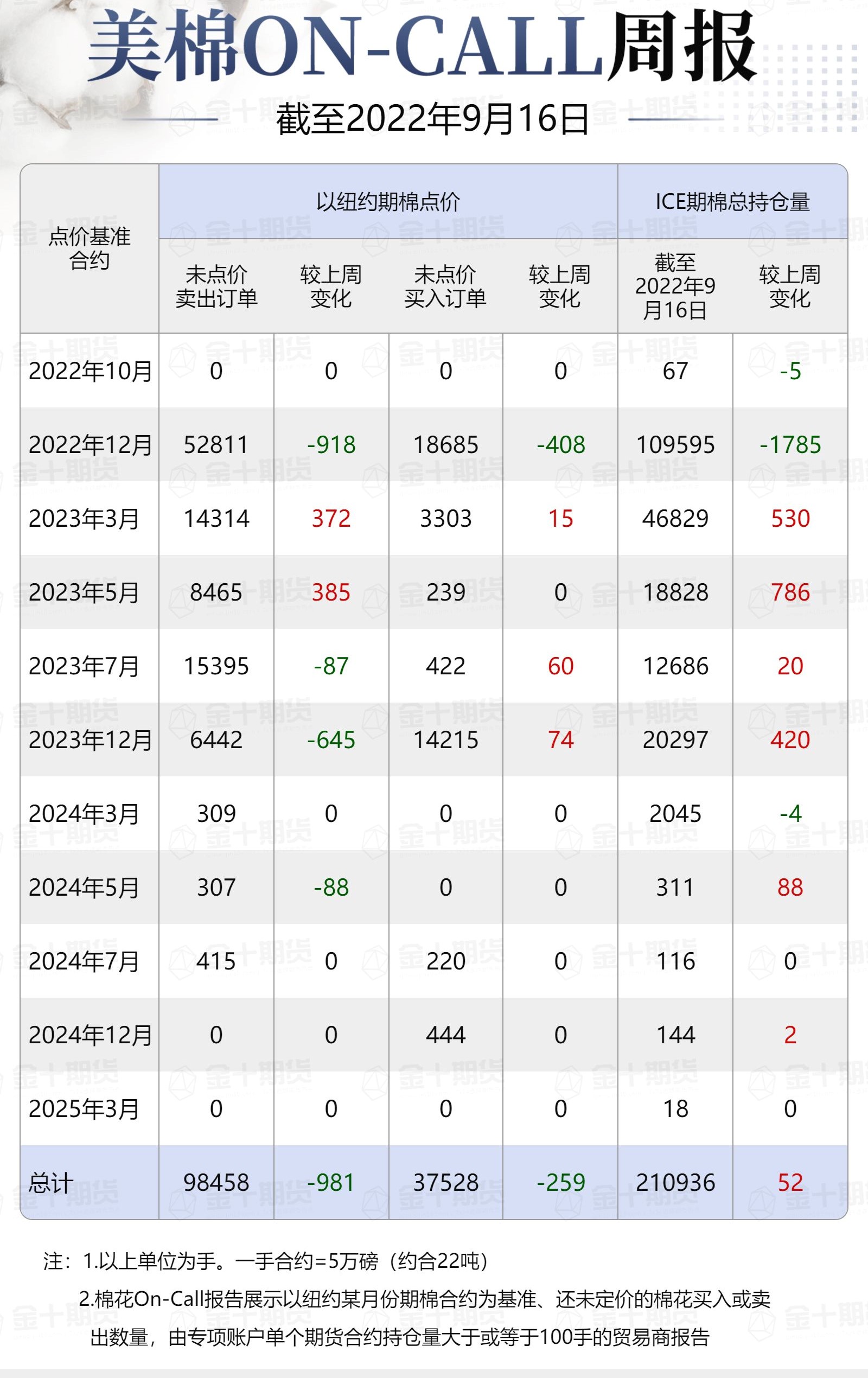 據(jù)美國商品期貨交易委員會(CFTC)最新數(shù)據(jù),截至9月16日,①美棉On-Call未點價賣出訂單98458手,環(huán)比減少981手;未點價買入訂單37528手,環(huán)比減少259手;②ICE期棉2210合約上賣方未點價合約為0手,較此前一周增加0手;③ICE期棉2212合約上賣方未點價合約為52811手,較此前一周減少918手;④ICE期棉2303合約上賣方未點價合約為14314手,較此前一周增加372手;⑤ICE期棉2305合約上賣方未點價合約為8465手,較此前一周增加385手;⑥ICE期棉2307合約上賣方未點價合約為15395手,較此前一周減少87手;⑦ICE棉花期貨盤面2022/23年度(8月至次年7月)的On-Call合約未點價賣出訂單為90985手,環(huán)比減少248手。
