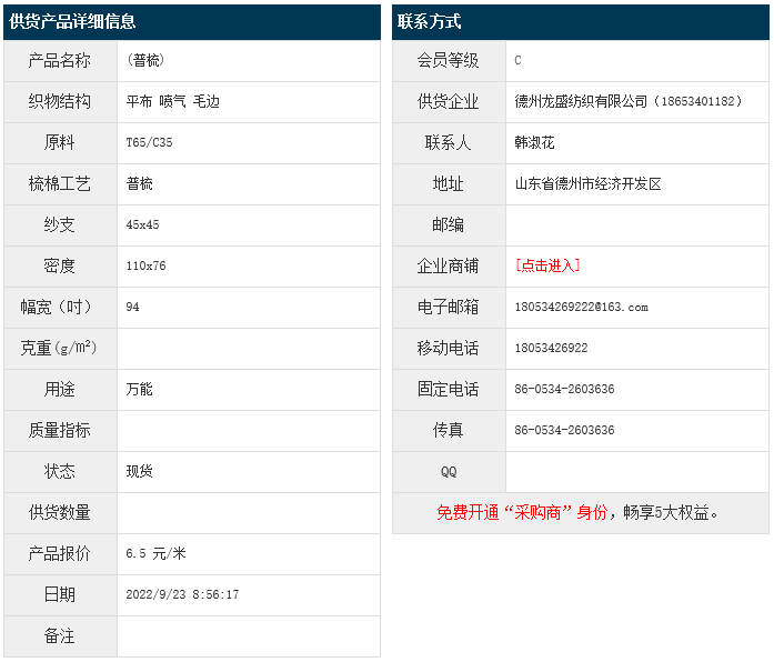 9月23日,德州龍盛紡織有限公司滌棉平布T65/C35 45x45 110x76 94" 噴氣 毛邊,報價為6.5元/米,實際成交價以協(xié)商為準(zhǔn)。[點擊查看詳情]