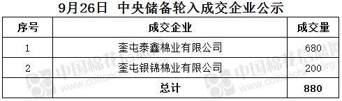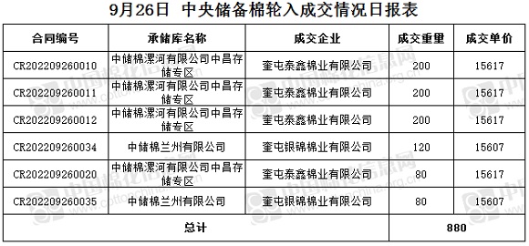 9月26日,中國儲備棉管理有限公司掛牌采購棉花6000噸(公定重量),實(shí)際成交880噸,成交率15%,成交均價(jià)15615元/噸,成交最高價(jià)15617元/噸,成交最低價(jià)15607元/噸。