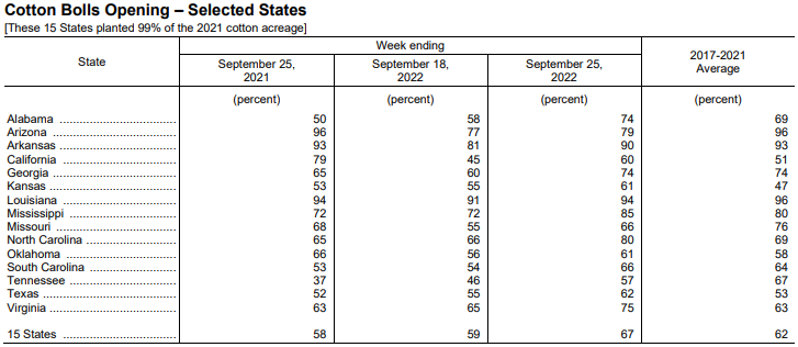 美國農(nóng)業(yè)部9月26日發(fā)布的美國棉花生長報告顯示,截至9月25日當周,美棉盛鈴率為67%,前周為59%,去年同期為58%,五年均值為62%。美棉收割率為15%,前周為11%,去年同期為11%,五年均值為14%。美棉生長優(yōu)良率為31%,前周為33%,去年同期為65%。