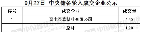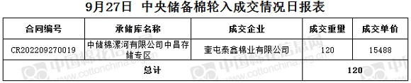 9月27日,中國儲備棉管理有限公司掛牌采購棉花6000噸(公定重量),實際成交120噸,成交率2%,成交均價15488元/噸,成交最高價15488元/噸,成交最低價15488元/噸。