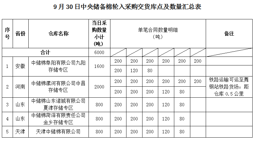中國儲備棉管理有限公司定于2022年9月30日采購棉花6000噸(公定重量)。具體庫點(diǎn)及數(shù)量如下:
