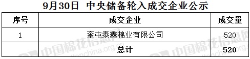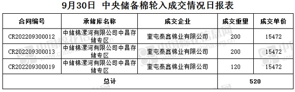 9月30日,中國儲(chǔ)備棉管理有限公司掛牌采購棉花6000噸(公定重量),實(shí)際成交520噸,成交率9%,成交均價(jià)15472元/噸,成交最高價(jià)15472元/噸,成交最低價(jià)15472元/噸。。