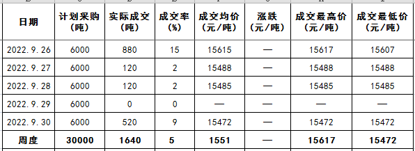 2022年9月26-30日是2022年中央儲(chǔ)備棉輪入第十二周,中國(guó)儲(chǔ)備棉管理有限公司掛牌采購(gòu)30000噸,實(shí)際成交1640噸,成交率5%,成交均價(jià)15551元/噸,成交最高價(jià)15617元/噸,成交最低價(jià)15472元/噸。