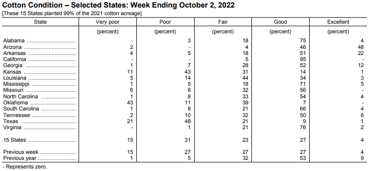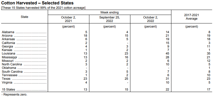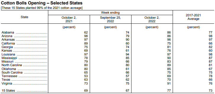 美國農(nóng)業(yè)部10月3日發(fā)布的美國棉花生長報(bào)告顯示,截至10月2日當(dāng)周,美棉盛鈴率為77%,前周為67%,去年同期為69%,五年均值為73%。美棉收割率為22%,前周為15%,去年同期為13%,五年均值為17%。美棉生長優(yōu)良率為31%,前周為31%,去年同期為62%。