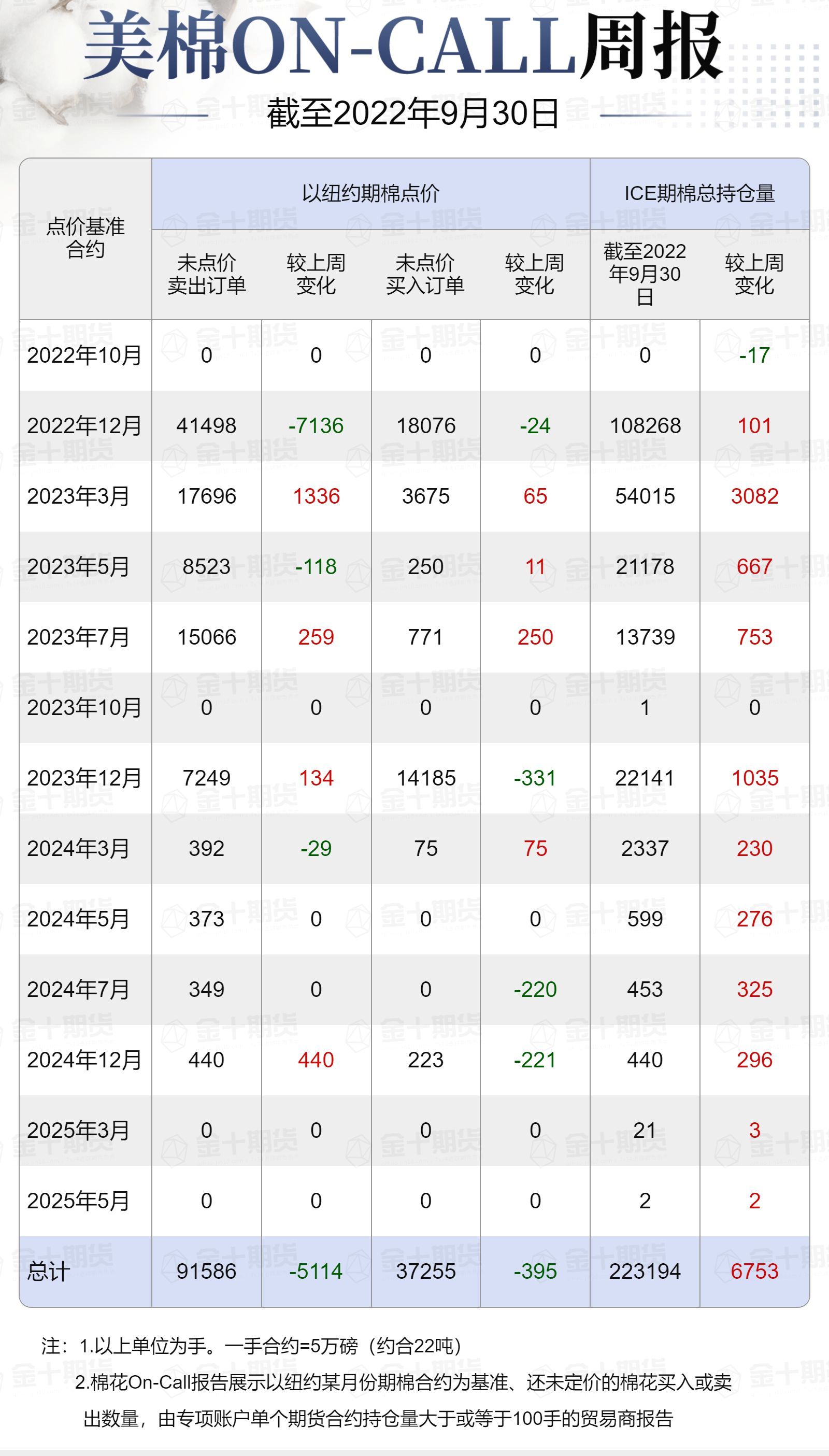 據(jù)美國商品期貨交易委員會(CFTC)最新數(shù)據(jù),截至9月30日,①美棉On-Call未點價賣出訂單91586手,環(huán)比減少5114手;未點價買入訂單37255手,環(huán)比減少395手;②ICE期棉2210合約上賣方未點價合約為0手,較此前一周增加0手;③ICE期棉2212合約上賣方未點價合約為41498手,較此前一周減少7136手;④ICE期棉2303合約上賣方未點價合約為17696手,較此前一周增加1336手;⑤ICE期棉2305合約上賣方未點價合約為8523手,較此前一周減少118手;⑥ICE期棉2307合約上賣方未點價合約為15066手,較此前一周增加259手;⑦ICE棉花期貨盤面2022/23年度(8月至次年7月)的On-Call合約未點價賣出訂單為82783手,環(huán)比減少5659手。