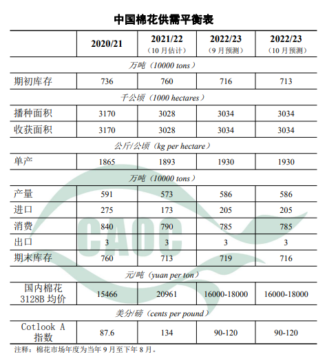 本月,根據(jù)海關(guān)統(tǒng)計(jì)數(shù)據(jù),將2021/22年度中國棉花進(jìn)口量調(diào)減2萬噸至173萬噸,棉花期末庫存調(diào)減至713萬噸。本月預(yù)測,新年度棉花產(chǎn)量、消費(fèi)量和進(jìn)口量維持上月預(yù)測不變。全國棉花進(jìn)入集中采收期,采摘進(jìn)度較往年偏慢。截至10月8日,全國新棉采摘進(jìn)度16.0%,同比下降1.2個(gè)百分點(diǎn)。