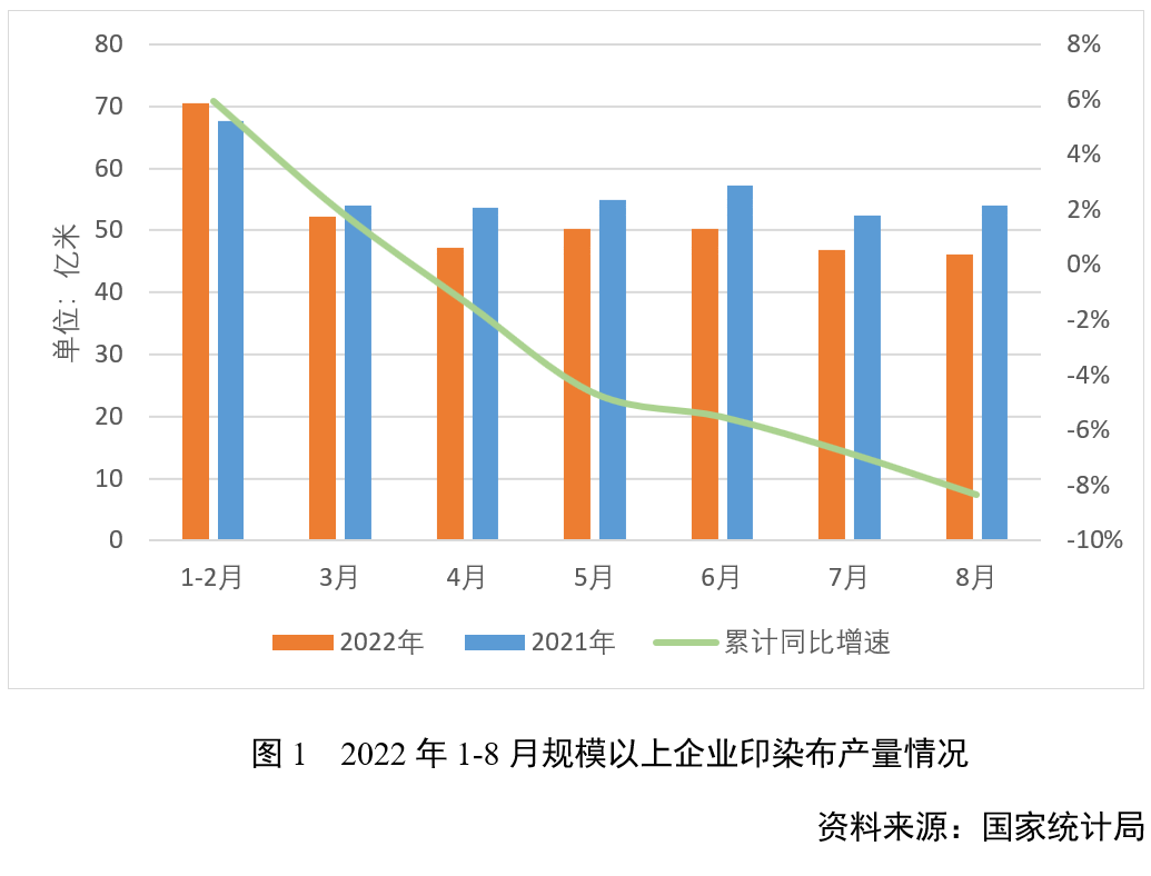 據(jù)國家統(tǒng)計(jì)局?jǐn)?shù)據(jù),2022年1-8月印染行業(yè)規(guī)模以上企業(yè)印染布產(chǎn)量360.98億米,同比降低8.34%,降幅較1-7月擴(kuò)大1.51個(gè)百分點(diǎn)。環(huán)比看,8月當(dāng)月規(guī)模以上印染企業(yè)印染布產(chǎn)量46.22億米,較7月降低1.44%,月度產(chǎn)量續(xù)創(chuàng)年內(nèi)新低,反映當(dāng)前需求不足的矛盾仍較突出,印染企業(yè)產(chǎn)能利用率整體較低。國家統(tǒng)計(jì)局?jǐn)?shù)據(jù)顯示,1-8月全國限額以上服裝鞋帽、針紡織品類商品零售額同比降低4.4%,降幅較1-7月收窄1.2個(gè)百分點(diǎn),但較去年同期回落29.2個(gè)百分點(diǎn),在疫情散發(fā)多發(fā)、歐美等國加快收緊貨幣政策、地緣政治風(fēng)險(xiǎn)延續(xù)等因素影響下,終端市場(chǎng)尤其是國內(nèi)市場(chǎng)對(duì)紡織品服裝的消費(fèi)需求恢復(fù)較為緩慢。