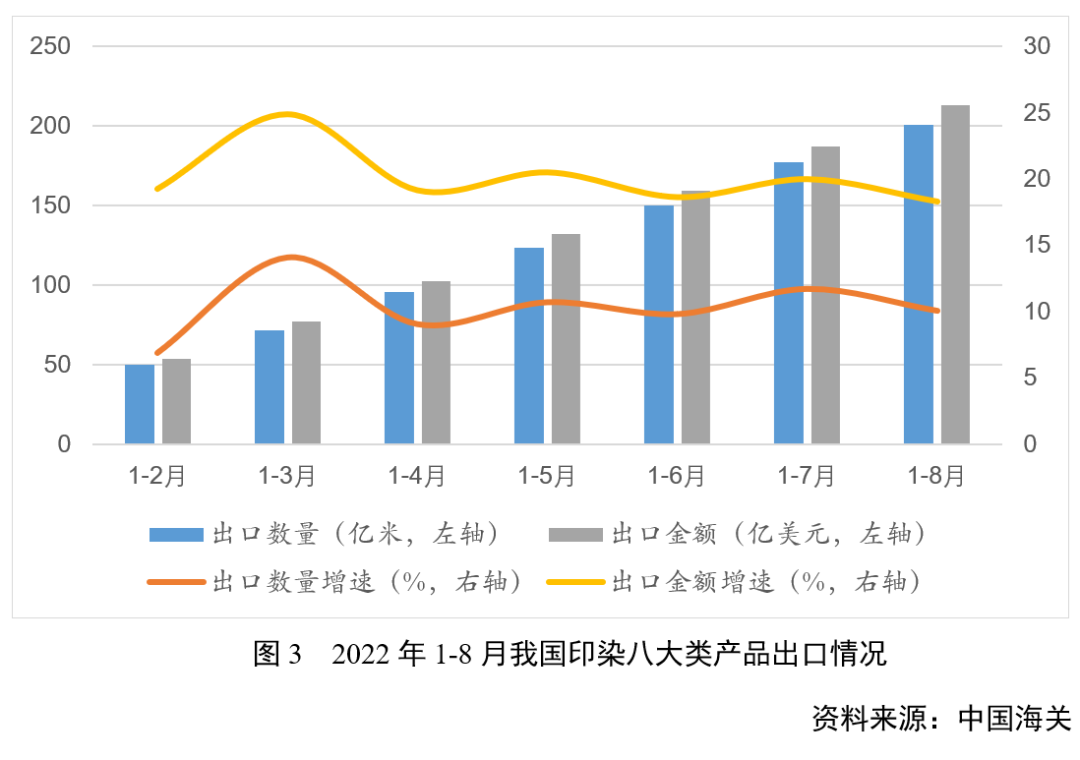 據(jù)中國海關(guān)統(tǒng)計(jì)數(shù)據(jù),2022年1-8月印染八大類產(chǎn)品出口數(shù)量200.85億米,同比增長10.06%;出口金額212.86億美元,同比增長18.31%;出口平均單價(jià)1.06美元/米,同比提高7.50%。分產(chǎn)品看,1-8月合成長絲織物出口數(shù)量和出口金額同比分別增長18.27%和30.15%,是印染八大類產(chǎn)品中出口占比最高、增長最快的品類;棉制產(chǎn)品出口因受美國出臺(tái)的所謂“新疆法案”影響而大幅下滑,純棉染色布、純棉印花布出口數(shù)量同比分別減少17.11%和20.54%。