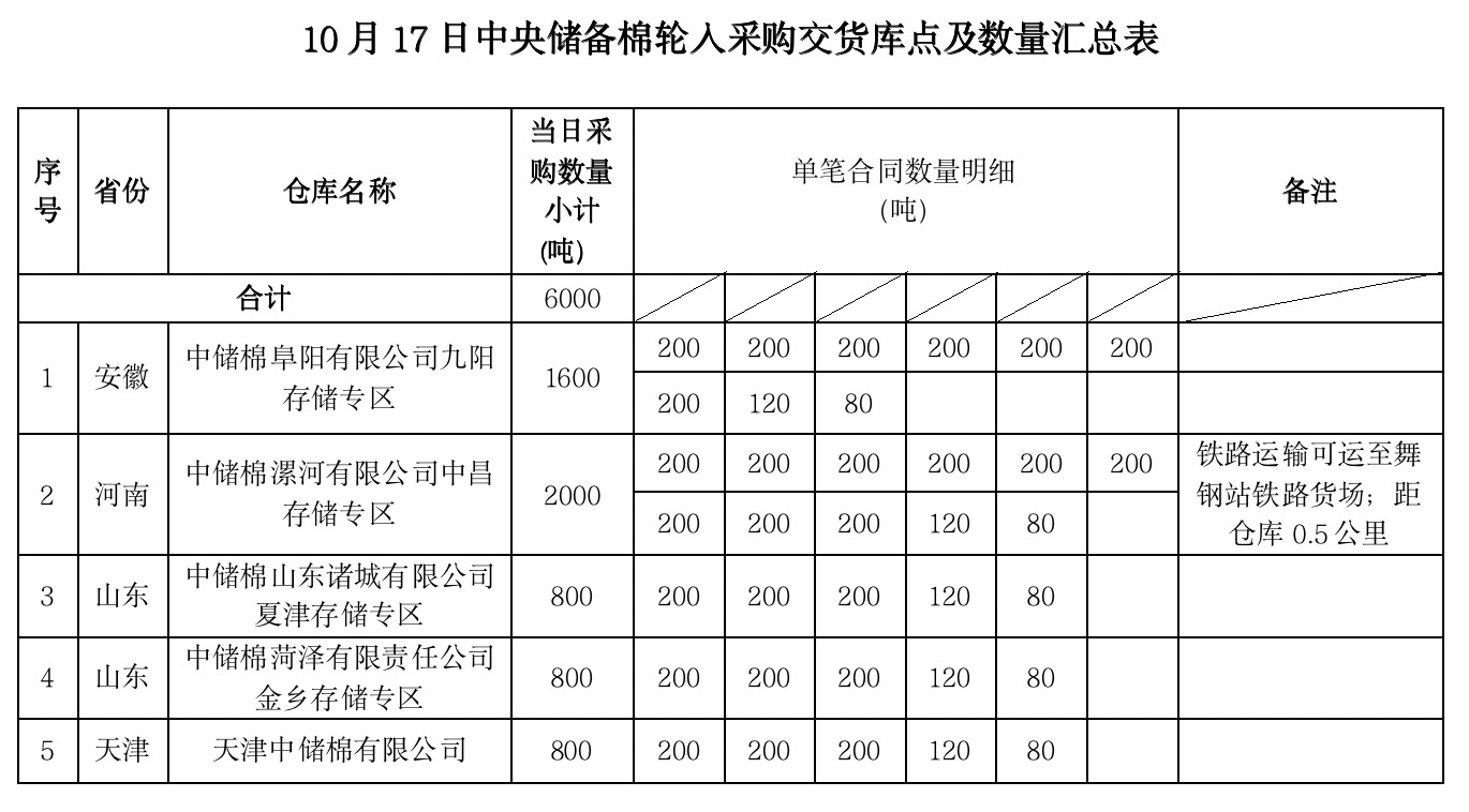 中國(guó)儲(chǔ)備棉管理有限公司定于2022年10月17日采購(gòu)棉花6000噸(公定重量)。具體庫(kù)點(diǎn)及數(shù)量如下: