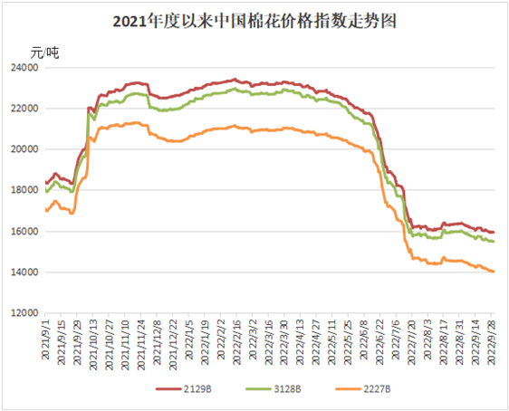 9月,進入新年度,國內新棉陸續(xù)采摘,少量企業(yè)開秤收購。受美聯(lián)儲加息導致的超預期緊縮政策影響,大宗商品價格的壓力顯現(xiàn),國內外棉價承壓下行。國內棉花資源供應依然充裕,棉企積極銷售存棉回籠資金,為入市收購新棉做準備,現(xiàn)貨價格連續(xù)下跌至本年度新低位。紡織廠開機率正常,新增訂單有所改善,成品去庫存加快,對棉花原料需求有所好轉。同期,國際棉價在需求轉弱下大幅下跌,內外價差倒掛幅度月末急速收窄。