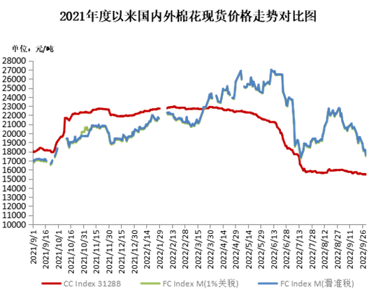 9月,國際棉價先漲后跌,月初受不利天氣等影響國際棉價有所上漲,月后期受美聯(lián)儲加息影響,國際棉花需求轉弱預期增強,國際棉花期貨一度跌停,現(xiàn)貨價格跟隨大幅下跌。中國進口棉價格指數(shù)FCIndexM月均119.03美分/磅,環(huán)比下跌7.73美分;月底104.85美分/磅,環(huán)比下跌27.27美分,1%關稅下折人民幣17470元/噸,高于同期國內現(xiàn)貨1968元,內外棉價價差逐漸縮小。