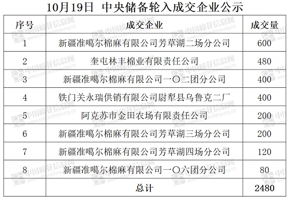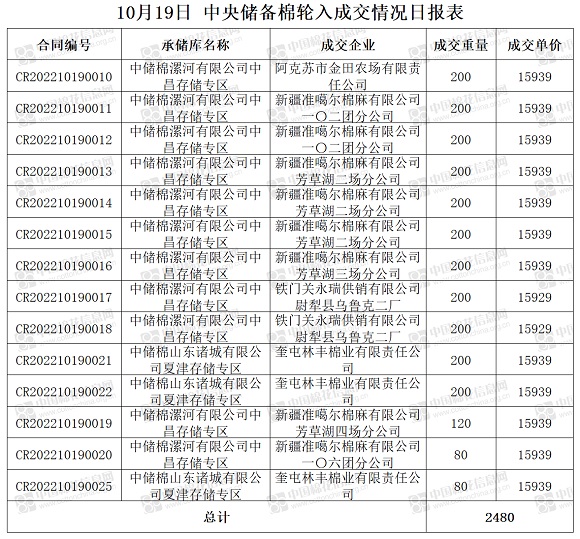 10月19日,中國儲備棉管理有限公司掛牌采購棉花6000噸(公定重量),實際成交2480噸,成交率41%,成交均價15937元/噸,成交最高價15939元/噸,成交最低價15929元/噸。