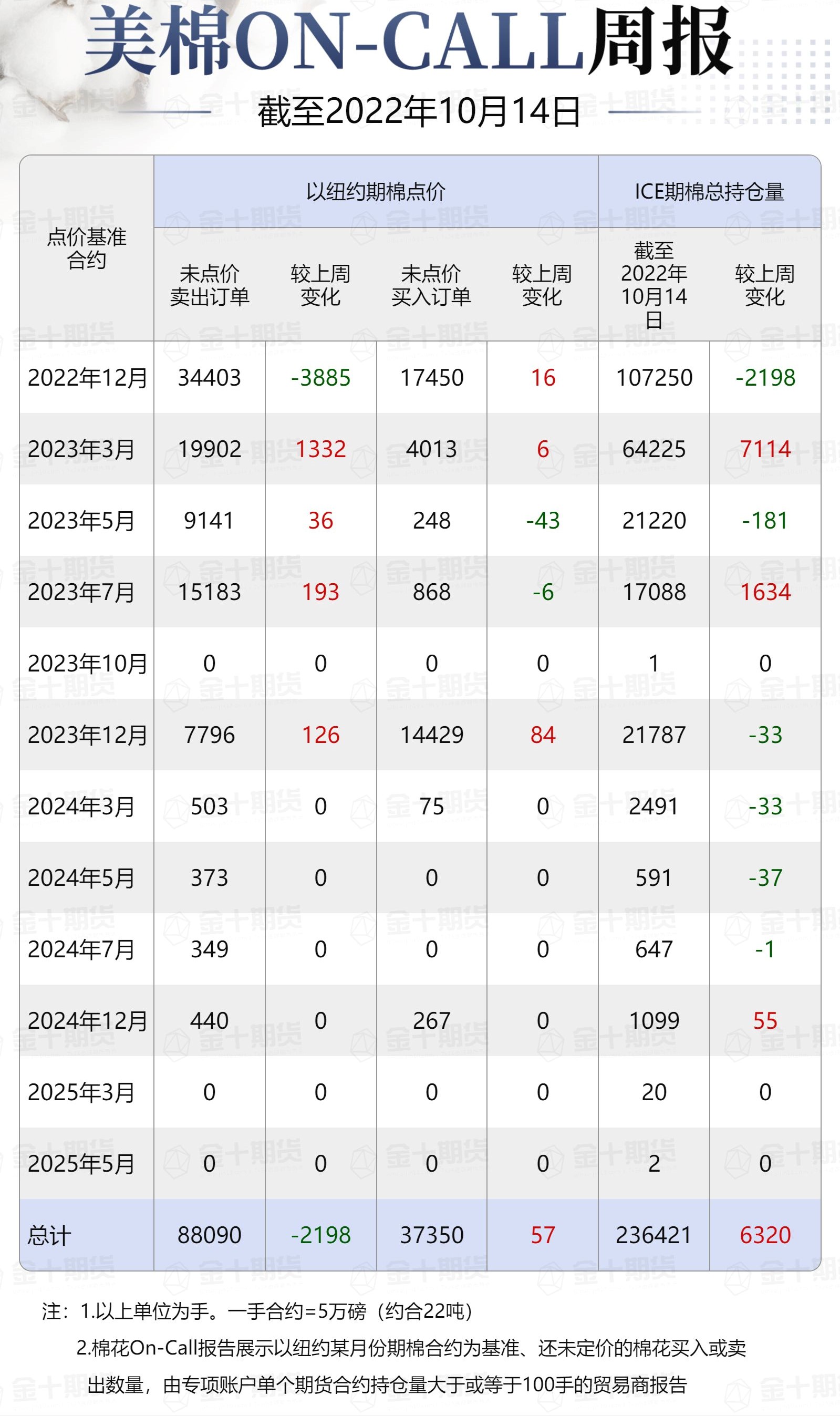 據(jù)美國(guó)商品期貨交易委員會(huì)(CFTC)最新數(shù)據(jù),截至10月14日,①美棉On-Call未點(diǎn)價(jià)賣出訂單88090手,環(huán)比減少2198手;未點(diǎn)價(jià)買入訂單37350手,環(huán)比增加57手;②ICE期棉2212合約上賣方未點(diǎn)價(jià)合約為34403手,較此前一周減少3885手;③ICE期棉2303合約上賣方未點(diǎn)價(jià)合約為19902手,較此前一周增加1332手;④ICE期棉2305合約上賣方未點(diǎn)價(jià)合約為9141手,較此前一周增加36手;⑤ICE期棉2307合約上賣方未點(diǎn)價(jià)合約為15183手,較此前一周增加193手;⑥ICE棉花期貨盤面2022/23年度(8月至次年7月)的On-Call合約未點(diǎn)價(jià)賣出訂單為78629手,環(huán)比減少2324手。