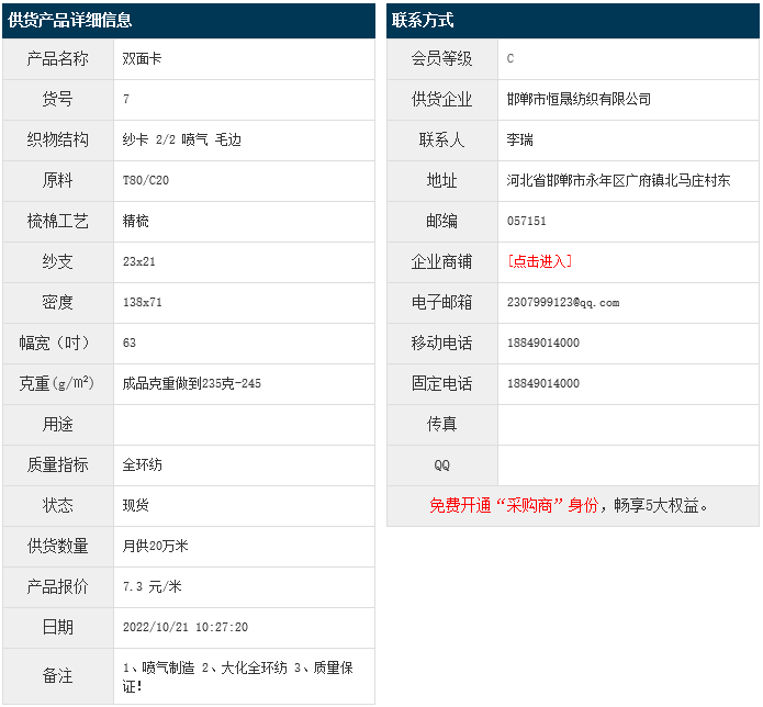 10月21日,邯鄲恒晟紡織有限公司大化滌棉雙面卡T80/JC20 23x21 138x71 63" 紗卡 2/2 噴氣 毛邊 成品235-245g/㎡,報價為7.3元/米,實際成交價以協(xié)商為準(zhǔn)。[點擊查看詳情]