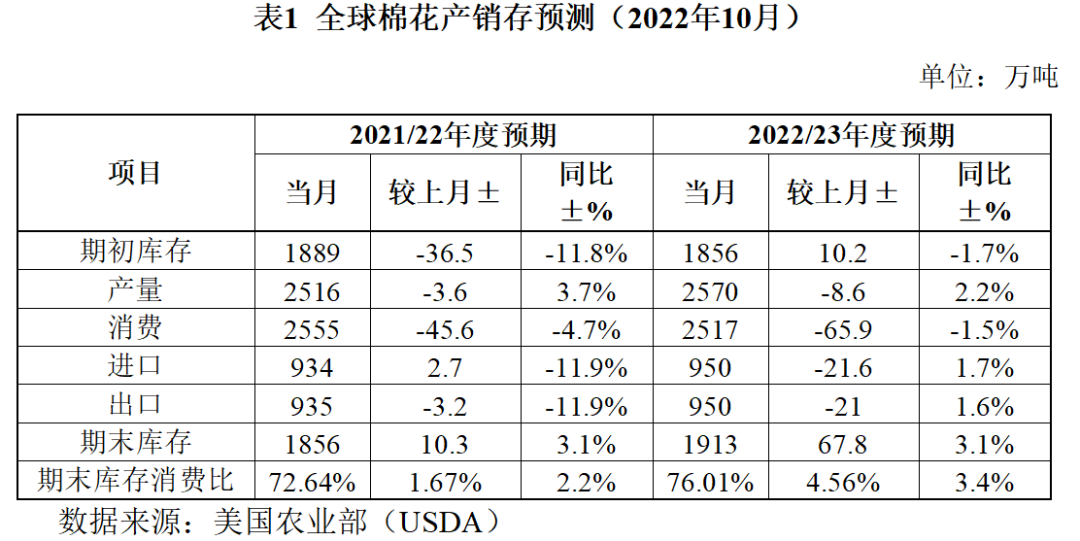 2022年10月美國農(nóng)業(yè)部發(fā)布全球棉花產(chǎn)銷存預(yù)測數(shù)據(jù)顯示,2022年度全球棉花產(chǎn)量為2570萬噸,環(huán)比調(diào)減0.3%,同比增加2.2%;消費(fèi)量2517萬噸,環(huán)比調(diào)減2.6%,同比下降1.5%;期末庫存消費(fèi)比由上期的71.45調(diào)升為76.01%,調(diào)增4.5個百分點(diǎn),同比增加3.4個百分點(diǎn)。從供給看,除美棉和巴基斯坦棉花預(yù)期減產(chǎn)80萬噸和17萬噸外,其他棉花生產(chǎn)國合計增產(chǎn)153萬噸超過減產(chǎn)數(shù)量,全球增產(chǎn)基本已成定局,接下來是北半球新花規(guī)模性上市期。受全球經(jīng)濟(jì)下滑影響,棉花消費(fèi)逐漸下降,期末庫存消費(fèi)比明顯抬升,全球棉花供求關(guān)系進(jìn)一步寬松。