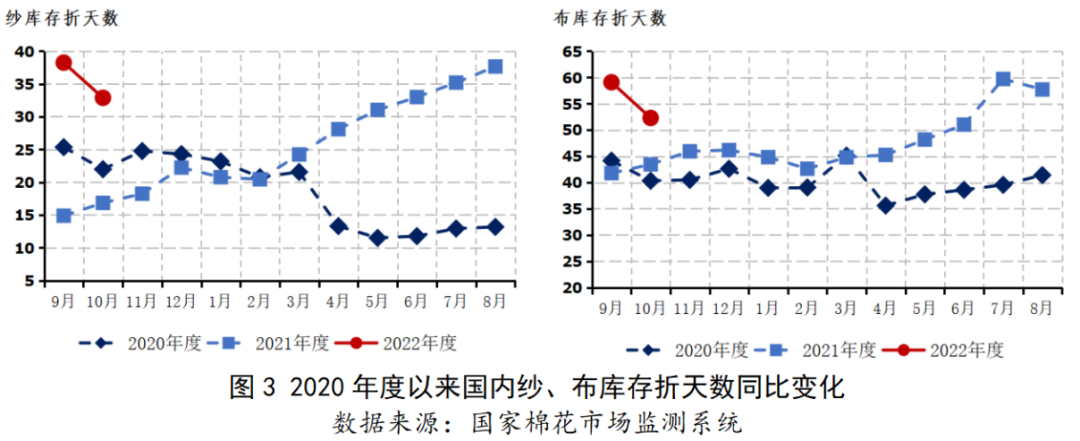 紡織廠紗、布訂單和庫存承壓。2022年春節(jié)后紡織市場進(jìn)一步降溫,市場低迷、訂單不足持續(xù)到后半年,部分紗、布企業(yè)壓縮生產(chǎn)、力爭去庫存改善經(jīng)營狀況。8月-9月中旬紡織市場有所改善,9月下旬后再度走弱。由于今年春節(jié)相對較早,預(yù)計元旦前后企業(yè)產(chǎn)銷漸入收尾階段,市場寄希望于來年春夏訂單。由于目前經(jīng)濟(jì)環(huán)境走弱,后期紡企訂單及庫存可能繼續(xù)承壓。