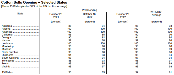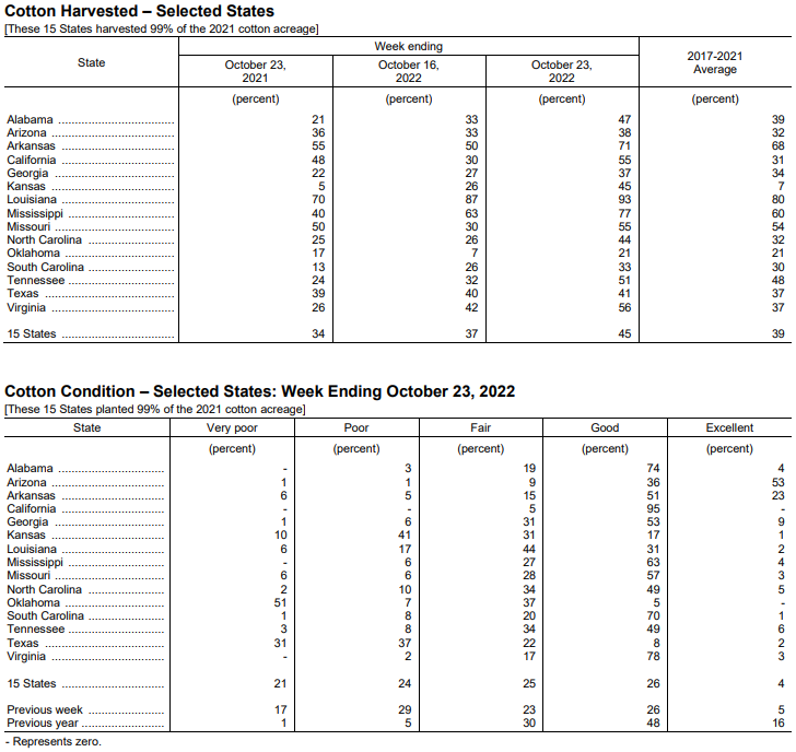 美國農(nóng)業(yè)部10月24日發(fā)布的美國棉花生長報(bào)告顯示,截至10月23日當(dāng)周,美棉盛鈴率為92%,前周為89%,去年同期為90%,五年均值為91%。美棉收割率為45%,前周為37%,去年同期為34%,五年均值為39%。美棉生長優(yōu)良率為30%,前周為31%,去年同期為64%。