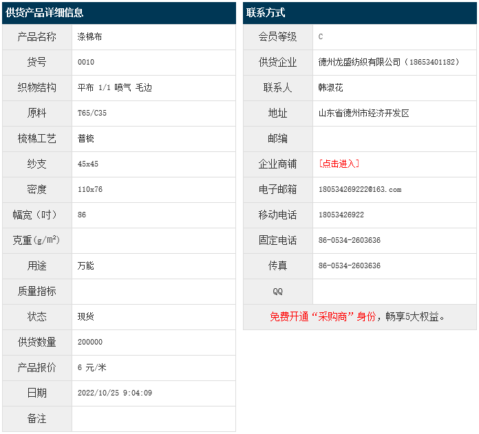10月25日,德州龍盛紡織有限公司滌棉平布T65/C35 45x45 110x76 86" 1/1 噴氣 毛邊,報(bào)價(jià)為6元/米,實(shí)際成交價(jià)以協(xié)商為準(zhǔn)。[點(diǎn)擊查看詳情]