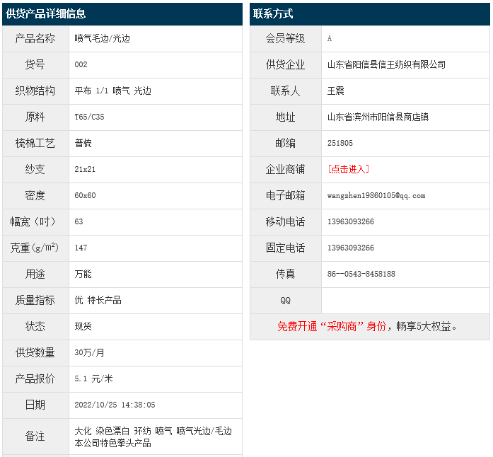 10月25日,山東陽信縣信王紡織有限公司大化滌棉平布T65/C35 21x21 60x60 63" 1/1 噴氣 光邊/毛邊,報價為5.1元/米,實際成交價以協(xié)商為準。[點擊查看詳情]