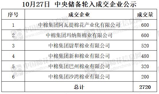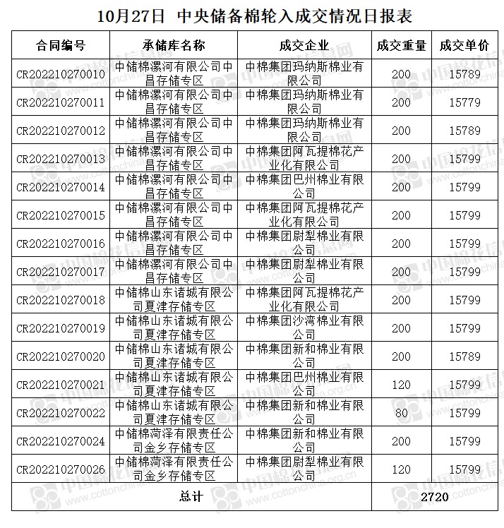 10月27日,中國儲備棉管理有限公司掛牌采購棉花6000噸(公定重量),實際成交2720噸,成交率45%,成交均價15795元/噸,成交最高價15799元/噸,成交最低價15779元/噸。