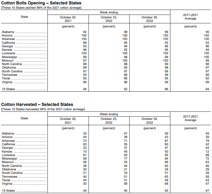 美國農(nóng)業(yè)部10月31日發(fā)布的美國棉花生長(zhǎng)報(bào)告顯示,截至10月30日當(dāng)周,美棉盛鈴率為96%,前周為92%,去年同期為94%,五年均值為94%。美棉收割率為55%,前周為45%,去年同期為44%,五年均值為47%。
