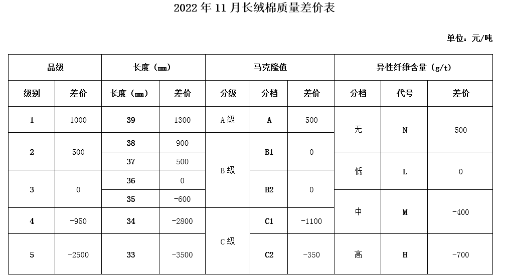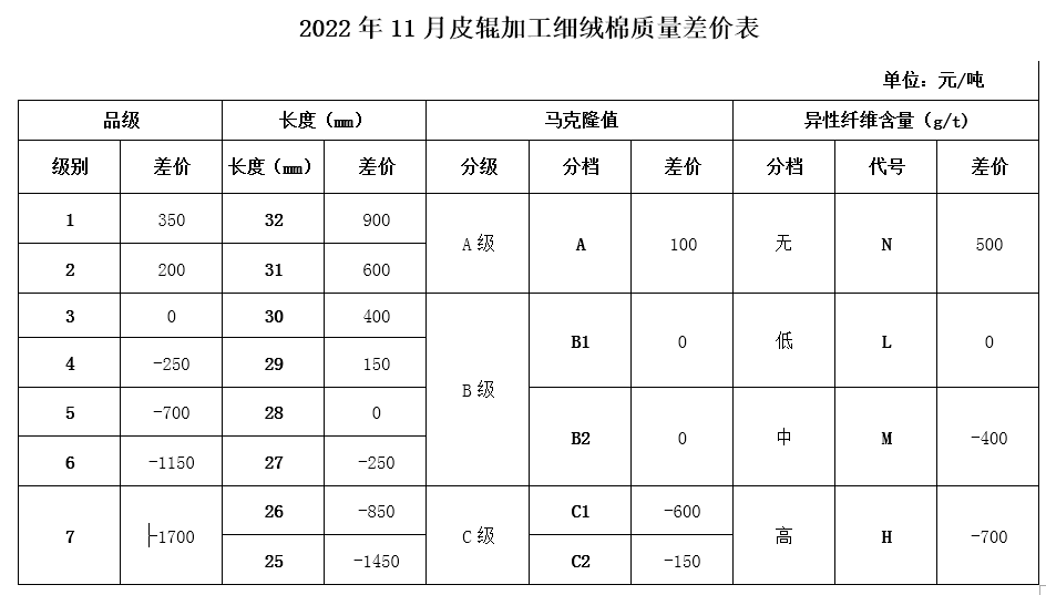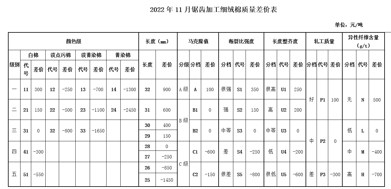 根據(jù)《中國棉花協(xié)會國產(chǎn)棉質(zhì)量差價表管理辦法》規(guī)定,現(xiàn)正式發(fā)布2022年11月《鋸齒加工細絨棉質(zhì)量差價表》、《皮輥加工細絨棉質(zhì)量差價表》和《長絨棉質(zhì)量差價表》(單位:元/噸)。