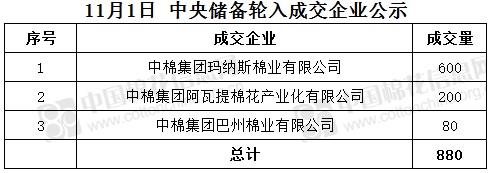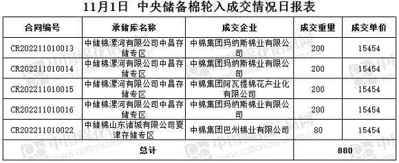 11月1日,中國(guó)儲(chǔ)備棉管理有限公司掛牌采購棉花6000噸(公定重量),實(shí)際成交880噸,成交率15%,成交均價(jià)15454元/噸,成交最高價(jià)15454元/噸,成交最低價(jià)15454元/噸。
