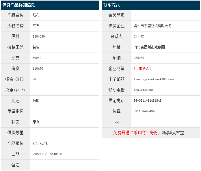 11月2日,晉州杰盛紡織有限公司滌棉平布T50/C50 40x40 110x70 98",報價為9.1元/米,實際成交價以協(xié)商為準(zhǔn)。[點擊查看詳情]