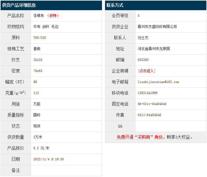 11月4日,晉州杰盛紡織有限公司滌棉平布T80/C20 32x32 78x65 88" 113g/㎡ 劍桿 毛邊,報(bào)價(jià)為6.2元/米,實(shí)際成交價(jià)以協(xié)商為準(zhǔn)。[點(diǎn)擊查看詳情]