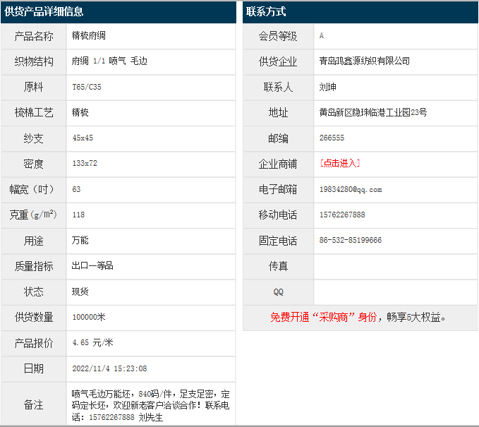 11月4日,青島鴻鑫源紡織有限公司滌棉府綢T65/JC35 45x45 133x72 63" 1/1 118g/㎡ 噴氣 毛邊,報價為4.65元/米,實際成交價以協(xié)商為準。[點擊查看詳情]