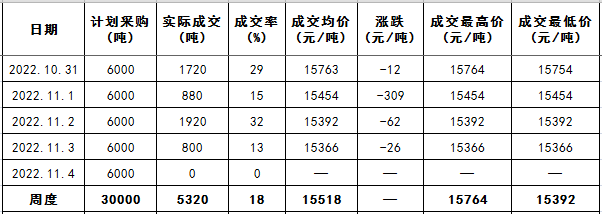 2022年10月31日-11月4日是2022年中央儲(chǔ)備棉輪入第十六周,中國儲(chǔ)備棉管理有限公司掛牌采購30000噸,實(shí)際成交5320噸,成交率17.73%,成交均價(jià)15518元/噸,成交最高價(jià)15764元/噸,成交最低價(jià)15366元/噸。