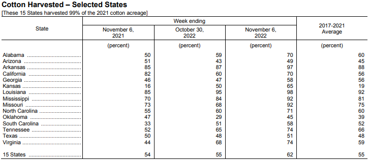 美國農(nóng)業(yè)部11月7日發(fā)布的美國棉花生長報(bào)告顯示,截至11月6日當(dāng)周,美棉收割率為62%,前周為55%,去年同期為54%,五年均值為55%。