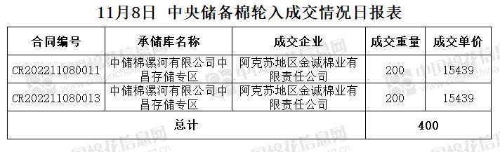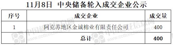 11月8日,中國儲(chǔ)備棉管理有限公司掛牌采購棉花6000噸(公定重量),實(shí)際成交400噸,成交率7%,成交均價(jià)15439元/噸,成交最高價(jià)15439元/噸,成交最低價(jià)15439元/噸。