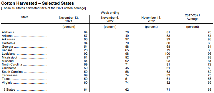 美國農(nóng)業(yè)部11月14日發(fā)布的美國棉花生長報告顯示,截至11月13日當(dāng)周,美棉收割率為71%,前周為62%,去年同期為64%,五年均值為63%。